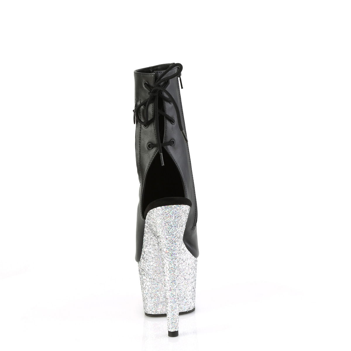 7″” (178mm) Heel, 2 3/4″” (70mm) Platform Open Toe/Heel Back Lace-Up Ankle Boot w/Hidden Zip Pocket, Inside Zip Closure