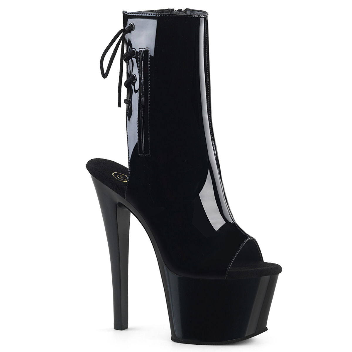 7″” (178mm) Heel, 2 3/4″” (70mm) Platform Open Toe/Heel Back Lace-Up Ankle Boot w/Hidden Zip Pocket, Inner Side Zip Closure
