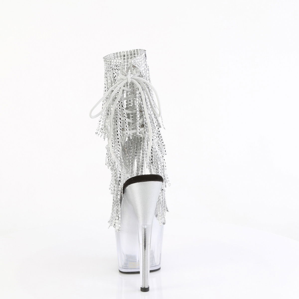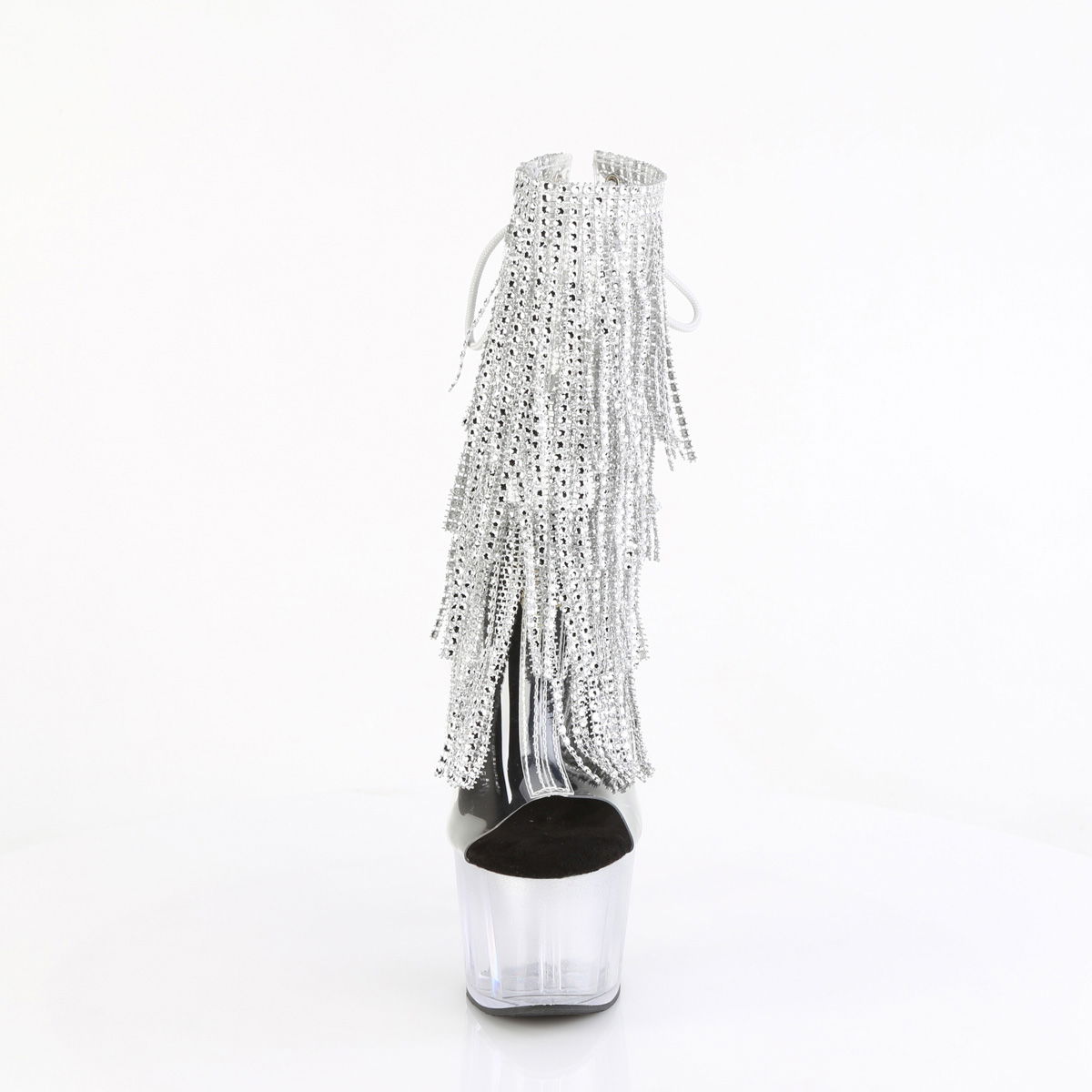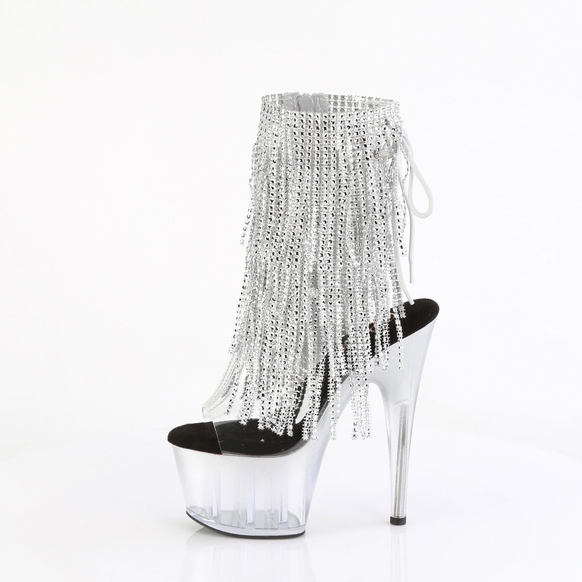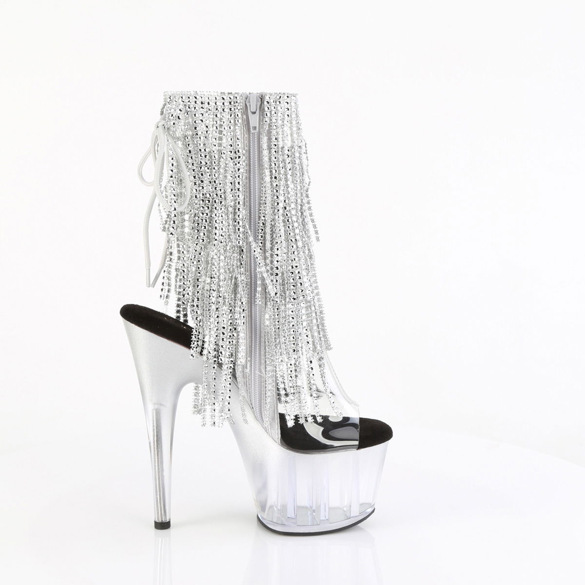 7″ Heel, 2 3/4″ PF Open Toe/Heel Lace-Up Fringe Ankle Boot