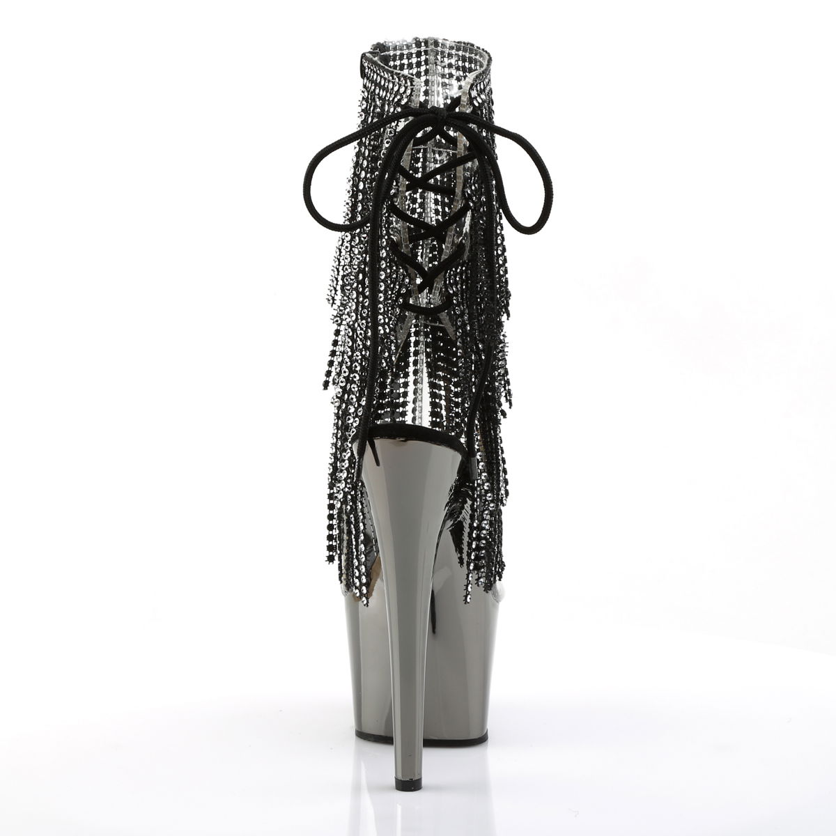 7″ Heel, 2 3/4″ PF Open Toe/Heel Lace-Up Fringe Ankle Boot
