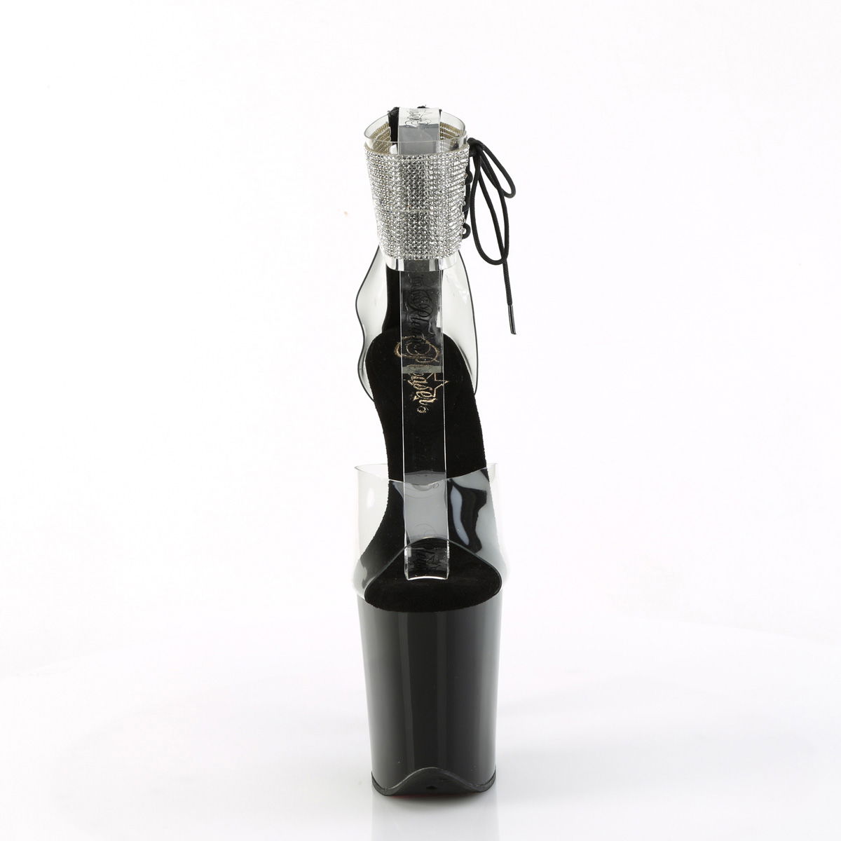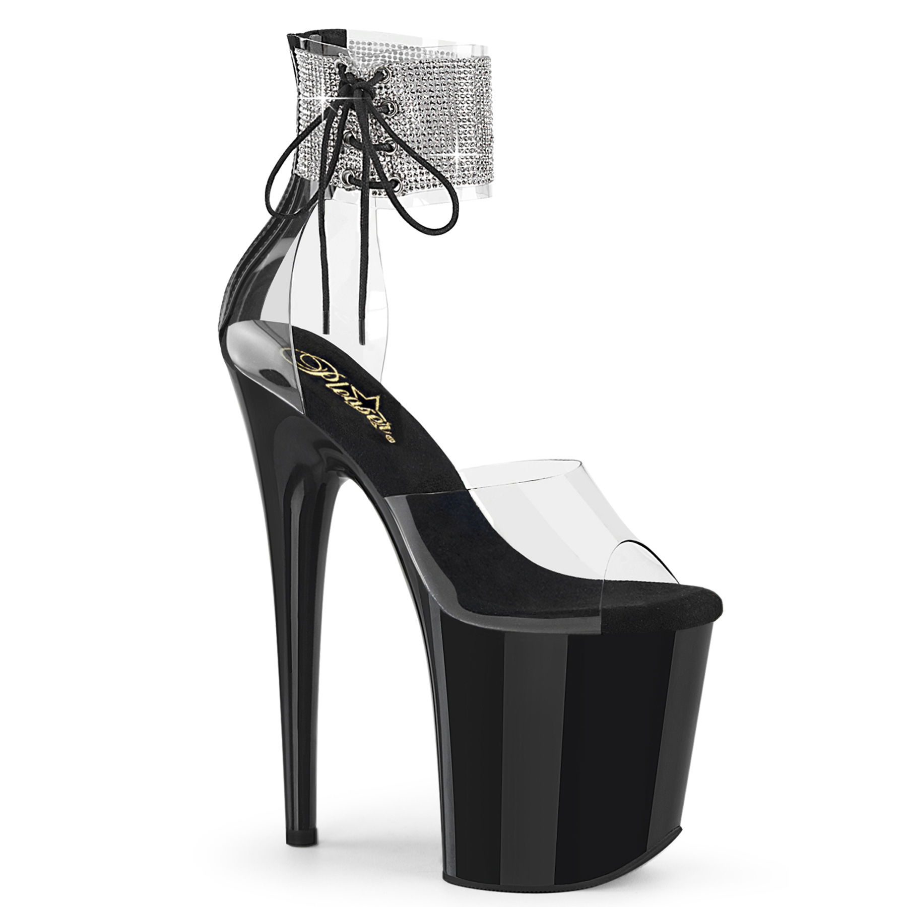 8″” (200mm) Heel, 4″” (100mm) Platform Close Back Rhinestone Embellished Ankle Cuff Sandal w/Side Lacing, Back Zip Closure