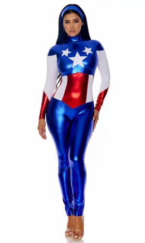 God Bless America! You’ll have people pledging their allegiances to you in our shimmering metallic Astonishing Allegiance sexy super hero catsuit, featuring a vibrant star and stripes design and mock neck style. Comes complete with matching blue headband.