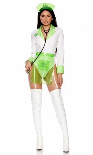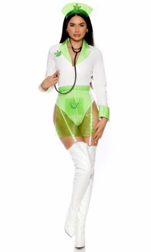3-piece sexy nurse costume features long sleeve zipfront bodysuit with contrast green lapels and cuffs with attached garter straps paired with transparent pvc apron with marijuana leaf embroidered decorative patch and matching headband.