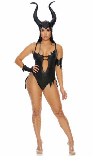 4pc. Sexy movie villain character costume features embossed bodysuit with double cross shoulder straps, jagged edge design, midsection cutout, matching single glove, armband and horn headpiece.