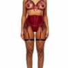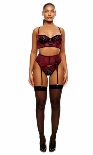 3-piece velvet rhinestone underwire cup longline bra and garter belt and matching panty with contrast sheer mesh panels.