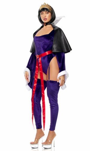 5pc. sexy storybook character costume features velvet bodysuit with garters and leg accessories and contrast satin cape with collar and gemstone belt and crown headband.