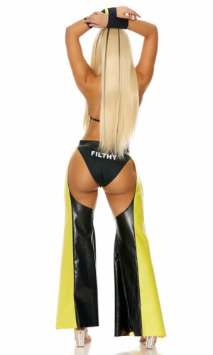 4pc. Sexy iconic superstar costume features striped triangle bra halter neck top paired with FILTHY screen print panty and faux leather screen printed chaps along with wrist cuffs.