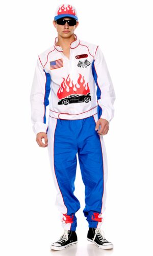 3-piece men’s racer costume features zipfront jogger jumpsuit with ornamental patches and “racing car” graphic and matching hat and glasses.