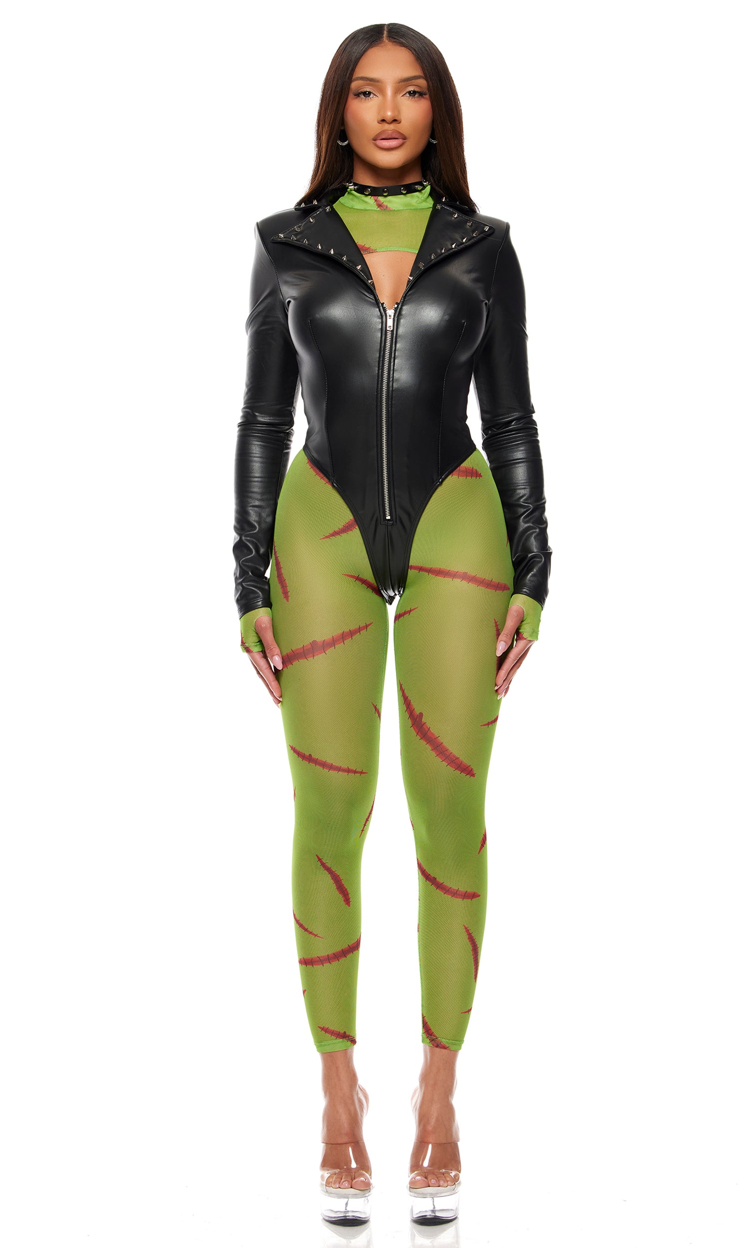 4-piece sexy monster costume features faux leather zipfront blazer style studded bodysuit and monster slash print mockneck sheer mesh bolero with matching leggings paired with studded choker.