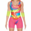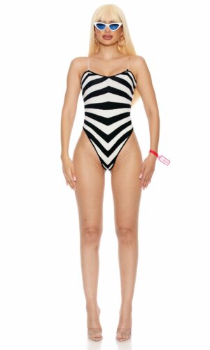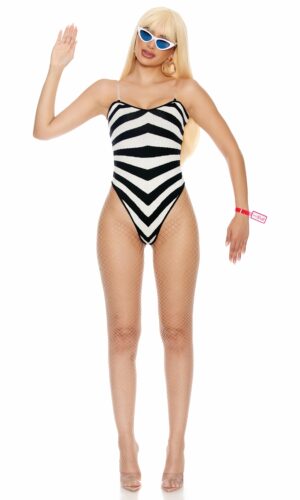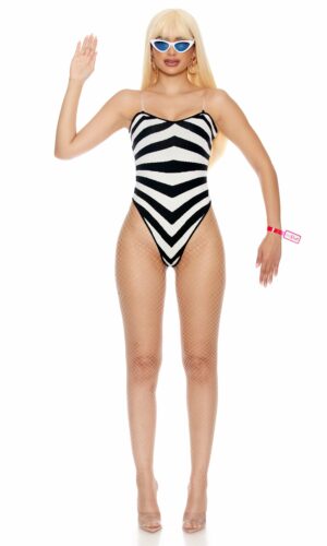 4-piece sexy doll costume features vintage inspired striped bodysuit paired with GENUINE DOLL” pvc snap bracelet and cat eye sunglasses and gold metal hoop earrings.