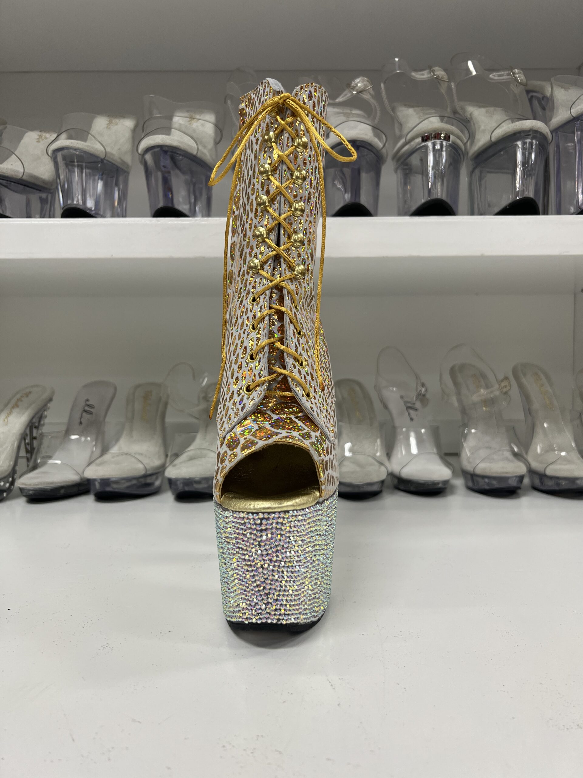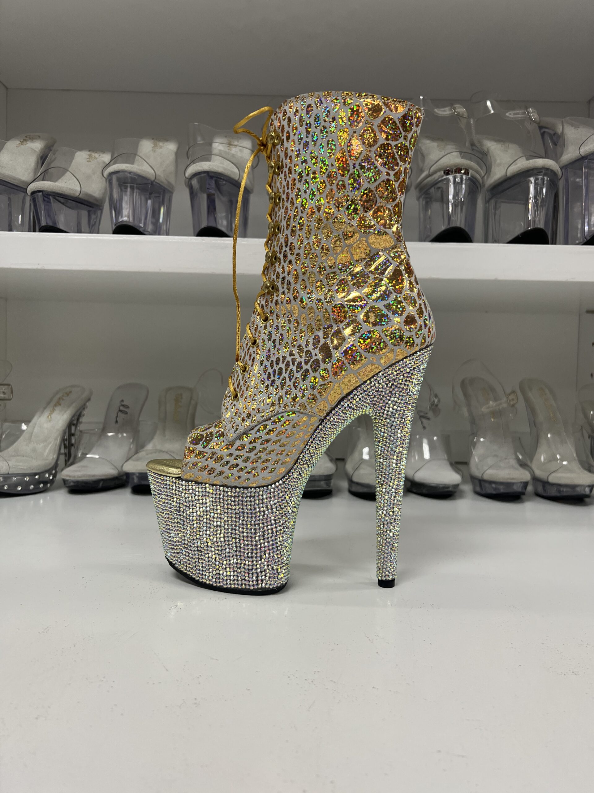 Gold Reptile Booties with 7″ Rhinestone Platform