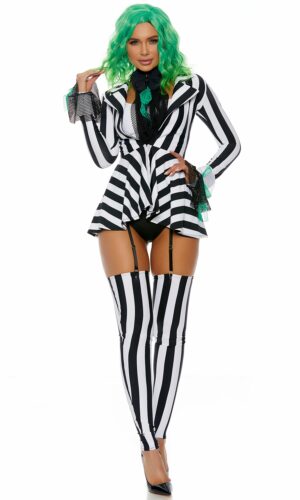 This sexy costume brings out all of your spooky spirit. Rock the striped jacket and leg accessories with coordinating cami, panty, tie, and green wig.