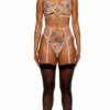 3-piece embroidered sheer polka dot mesh chemise with garters and belt and matching panty with embroidered floral contrast lace panels and keyhole cutout and lace-up ties at back.