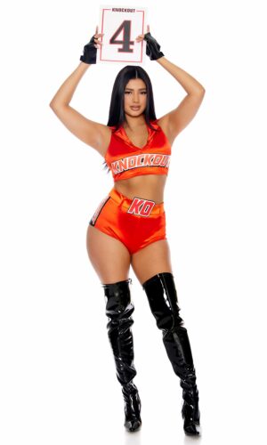 2-piece sexy ring card woman features collared crop top including KNOCKOUT” screen print at center paired with matching shorts and belt with rubber “KO” at center and fingerless gloves and prop ring card.