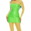 4pc. sexy cartoon character costume features metallic contrast collar bodysuit with garters paired with a PVC peplum skirt and leg accessories.