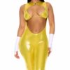3-piece sexy video game character costume features metallic foil triangle top and faux fur hooded open front panel jumpsuit with spike detail at back paired with fingerless gloves.