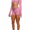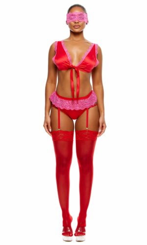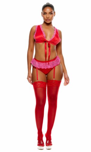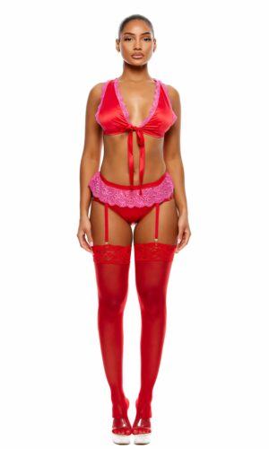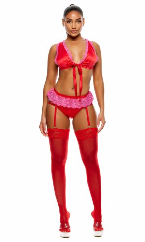 No Strings Attached Satin and Mesh Lace Trim Bra and Garter Belt Lingerie Set – Red Pink