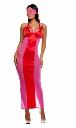 3-piece stretch satin underwire cup halterneck nightgown and matching panty and eye mask set with lace ruched elastic trim and ties on both bra cups and sheer mesh contrast panels and back slit.
