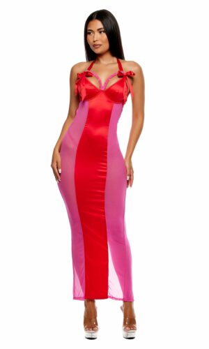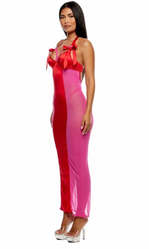 No Strings Attached Satin and Mesh Lace Trim Nightgown Lingerie Set – Red Pink