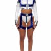 4pc. sexy astronaut costume features vinyl zipfront long sleeve jumpsuit with contrast piping and pockets paired with pinch buckle belt and glasses.