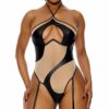 Vinyl and lace contrast halterneck teddy with garters with thigh strap detail.