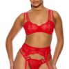 3-piece sheer wave mesh bra and garter belt and matching panty set with drawstring and faux pearl embellishment.