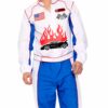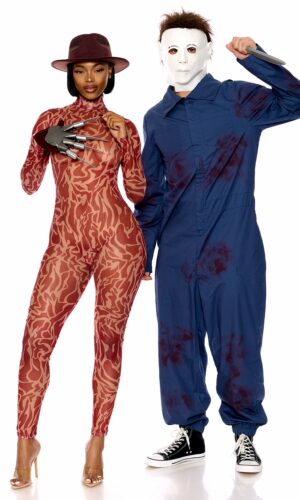 3-piece men’s movie character costume features jogger jumpsuit with blood platter graphic print and full mask and prop knife.
