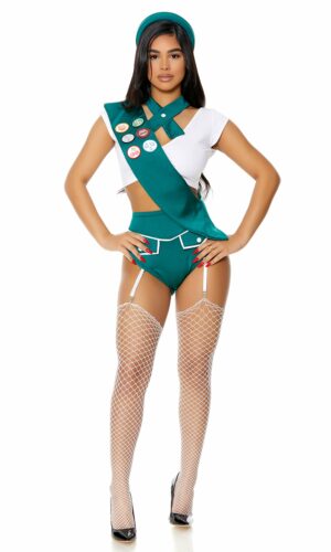 5pc. Sexy girl scout costume includes ruched crop top paired with panty with faux pocket detail and attached garter straps and includes matching necktie and crossbody sash with decorative patches and matching headband.