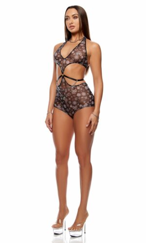 Assorted charm print sheer mesh wireless halterneck romper with side cutouts and chain and O-ring hardware accents.