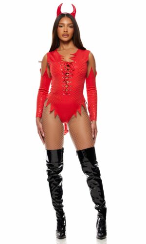 No one will mind being teased and poked with your pitchfork when you rule the depths of Hades in our Sizzle N’ Shine Sexy Devil Costume. Its sultry metallic bodysuit features a jagged neckline and matching thigh trim. Includes gloves and naughty headband.