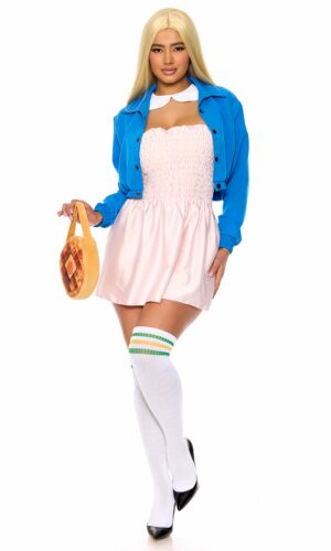 5-piece sexy TV show character costume features smocked dress and contrast cropped jacket paired with collar and socks and waffle print bag.