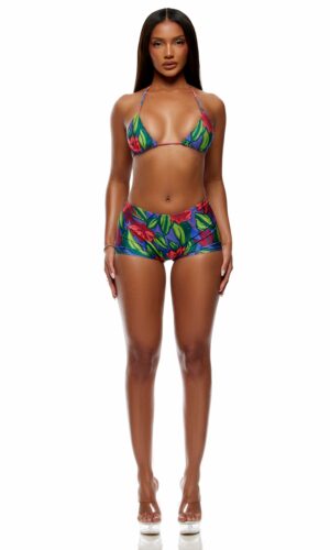 2pc. printed triangle halter bikini set features ruching channel ties and shorts.
