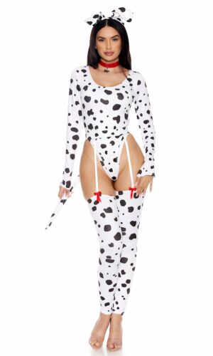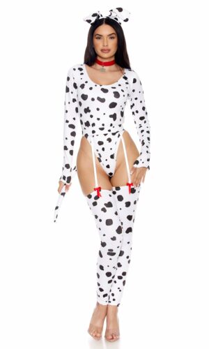 5-piece sexy dalmatian costume features long sleeve scoop neck dalmatian print bodysuit paired with matching garter belt with bow detail and leg accessories and choker with metal bone shaped tag and dog ear headband.