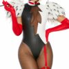 3pc. Sexy cat burglar costume includes vinyl plunging neckline bodysuit paired with matching cat ear mask and gloves and money bag.
