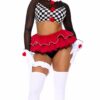 2pc. sexy jester clown costume featured zipback diamond print jumpsuit with ruffle trim and jester headband.