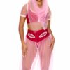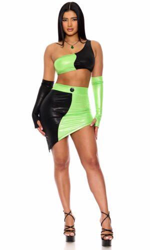 4-piece sexy TV character costume metallic foil color block one shoulder top and match asymmetrical skirt with matching fingerless gloves and necklace.