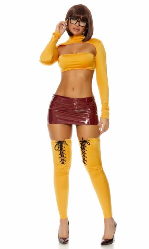 4pc. Sexy cartoon character costume features mock neck long sleeve cutout crop top paired with vinyl min skirt and lace-up leg accessories and glasses.