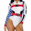 4pc. sexy racer costume features zipfront mockneck long sleeve bodysuit with high-leg, checkerprint contrast, authentic patches, matching gloves, aviator sunglasses and fishnet pantyhose.