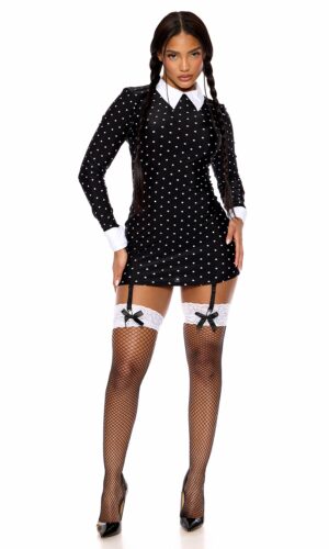 Sexy TV show character costume features polka dot print dress contrast collar and wrists and attached garters.