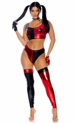 5-piece sexy comic book character costume features color blocked crop top with star and diamond screen print at chest paired with matching panty and leg accessories and PUDDIN” choker and fingerless gloves.